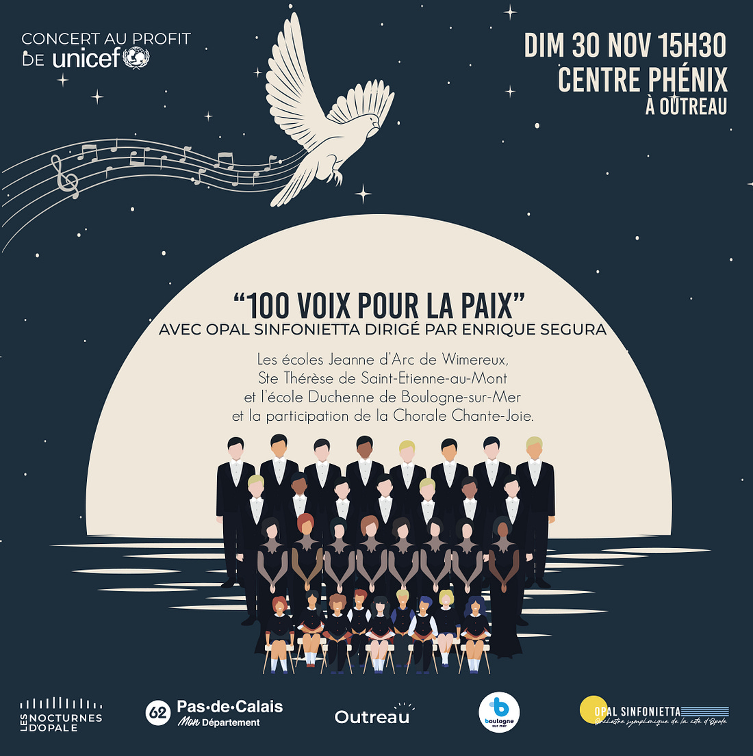 L’orchestre Opal Sinfonietta, dirigé par Enrique Segura, proposera une sélection des plus belles musiques pour évoquer la paix. Il sera accompagné de chœurs d’enfants des écoles Jeanne d’Arc de Wimereux, Ste Thérèse de St-Étienne-au-Mont, Duchenne de Boulogne/Mer.